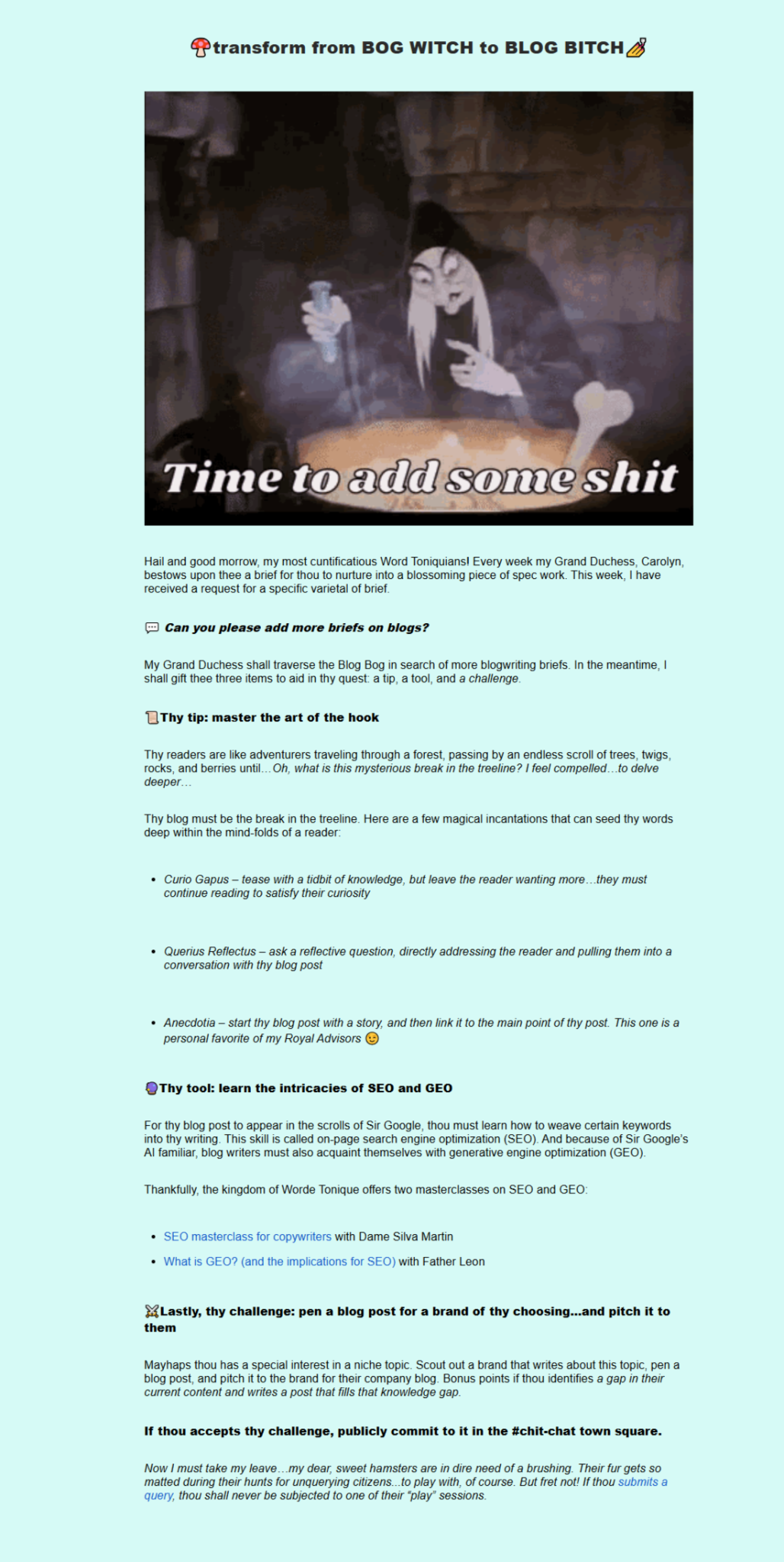Ask the Query Queen takes the classic "agony aunt"-style advice column and puts a fantasy twist on it, merging together "ye olde English"-style language with Gen-Z slang...all while still delivering actionable copywriting and career advice.