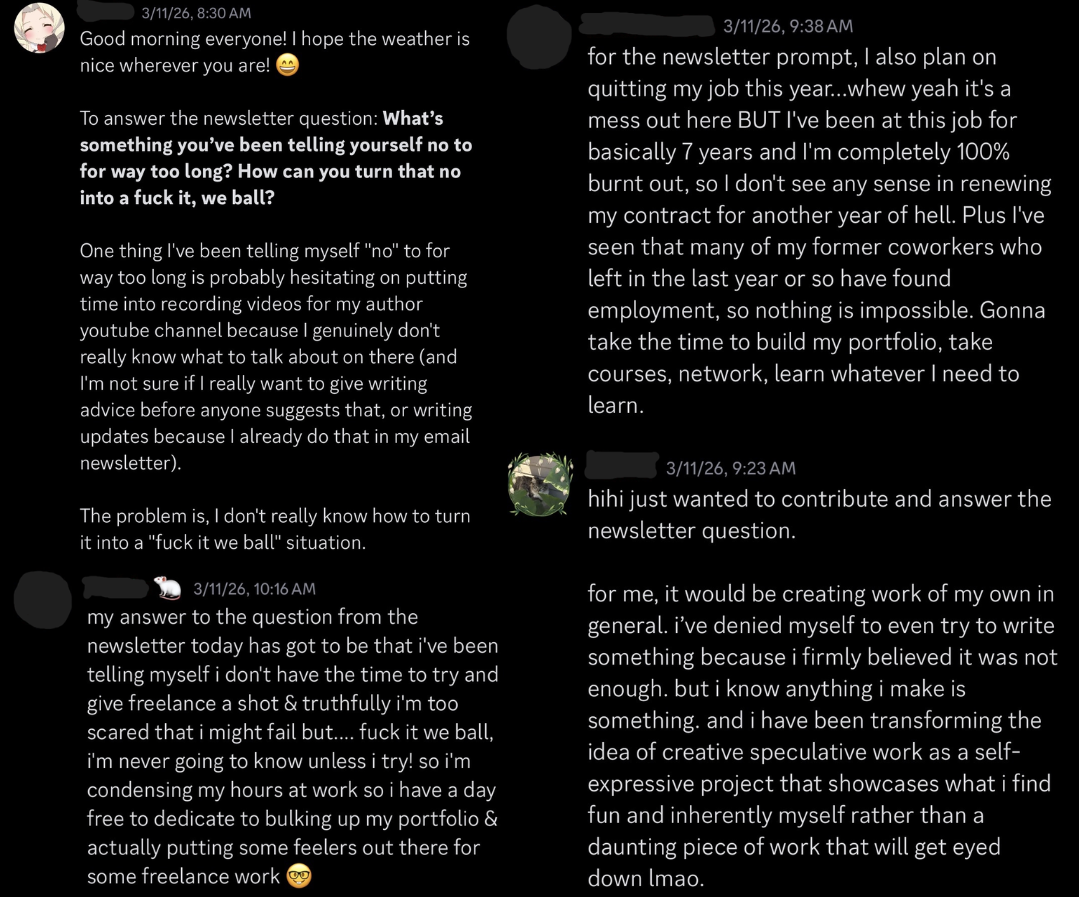 Members consistently respond to the conversational prompt in the Discord, as showcased below.