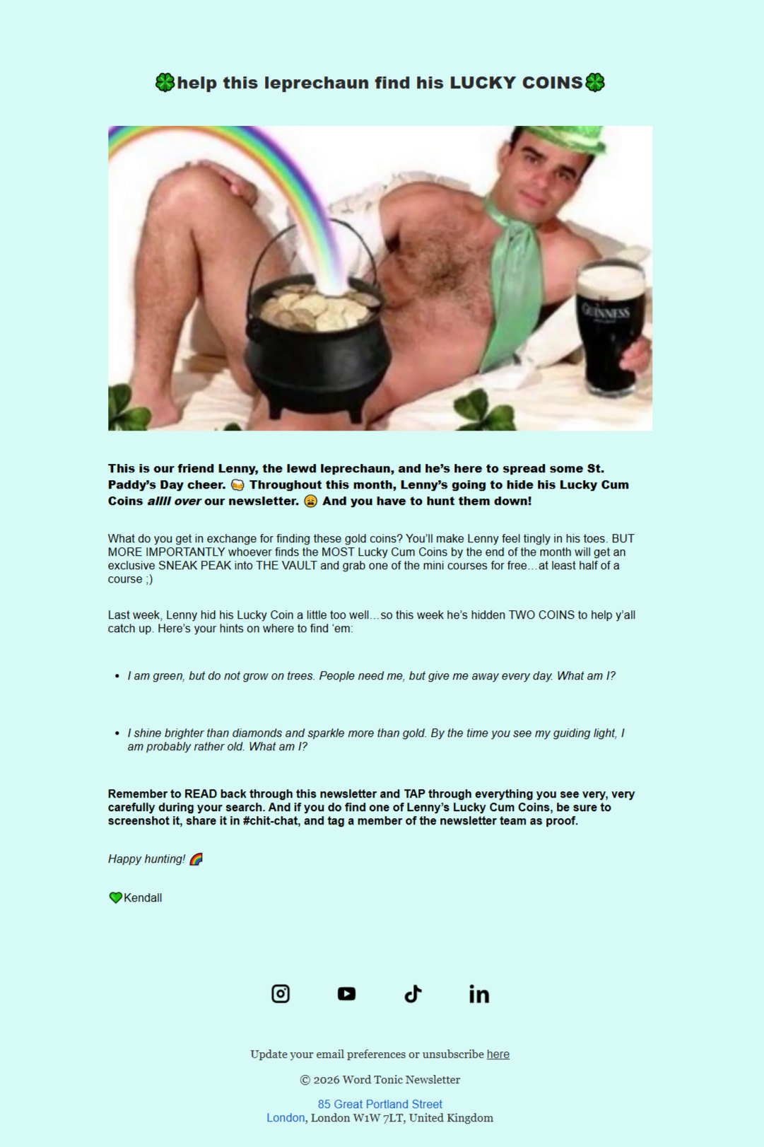 Every month, we facilitate an interactive activity through the newsletter. We've hosted polls for members to vote on their favorite masterclasses and designed puzzles for readers to solve for a chance to win discounts on Word Tonic products. However, our most successful campaign was Lenny's Lucky Coin Hunt.